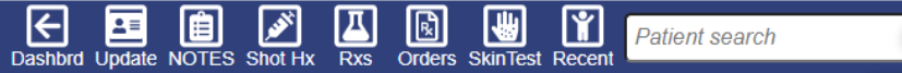You will also see a series of Quick Buttons in the main header. These buttons are configured to open specific Screens or Windows. Some typical ones include the Order Entry Screen, Prescription Order Window, and the Injection History Window although your configuration may feature others, too.